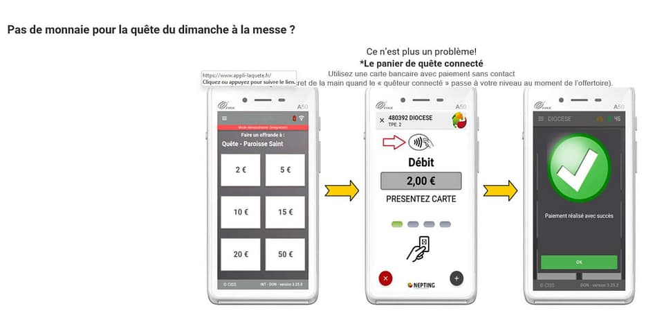 Pour ceux d’entre-nous qui n’avons jamais de monnaie dans nos poches, plus d’excuses, un panier de quêtes connecté nous permet d’effectuer notre offrande avec notre carte bancaire. Il