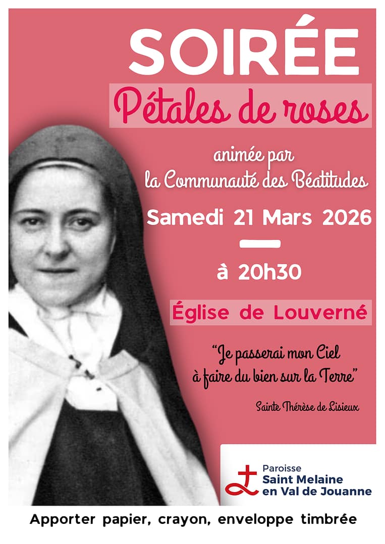 Le samedi 21 mars prochain, une nouvelle édition de la « Soirée Pétales de Roses« se déroulera en l’église de Louverné. Il s’agit d’une soirée de prières et de louange, guidée par une sœur de la Communauté des Béatitudes, qui se conclut par des témoignages des fruits reçus après cette soirée.